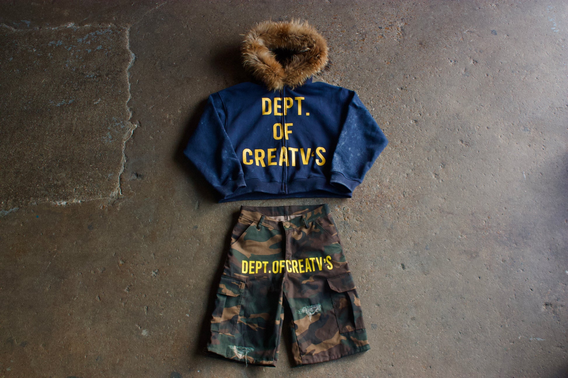 The DEPT OF CREATV’S FUR HOODED FULL ZIP is a statement essential designed for creators who value individuality, warmth, and timeless streetwear appeal. Offered in two distinct colorways—washed pink and deep navy—each piece carries the same bold identity with its signature “DEPT. OF CREATV’S”chest graphic.